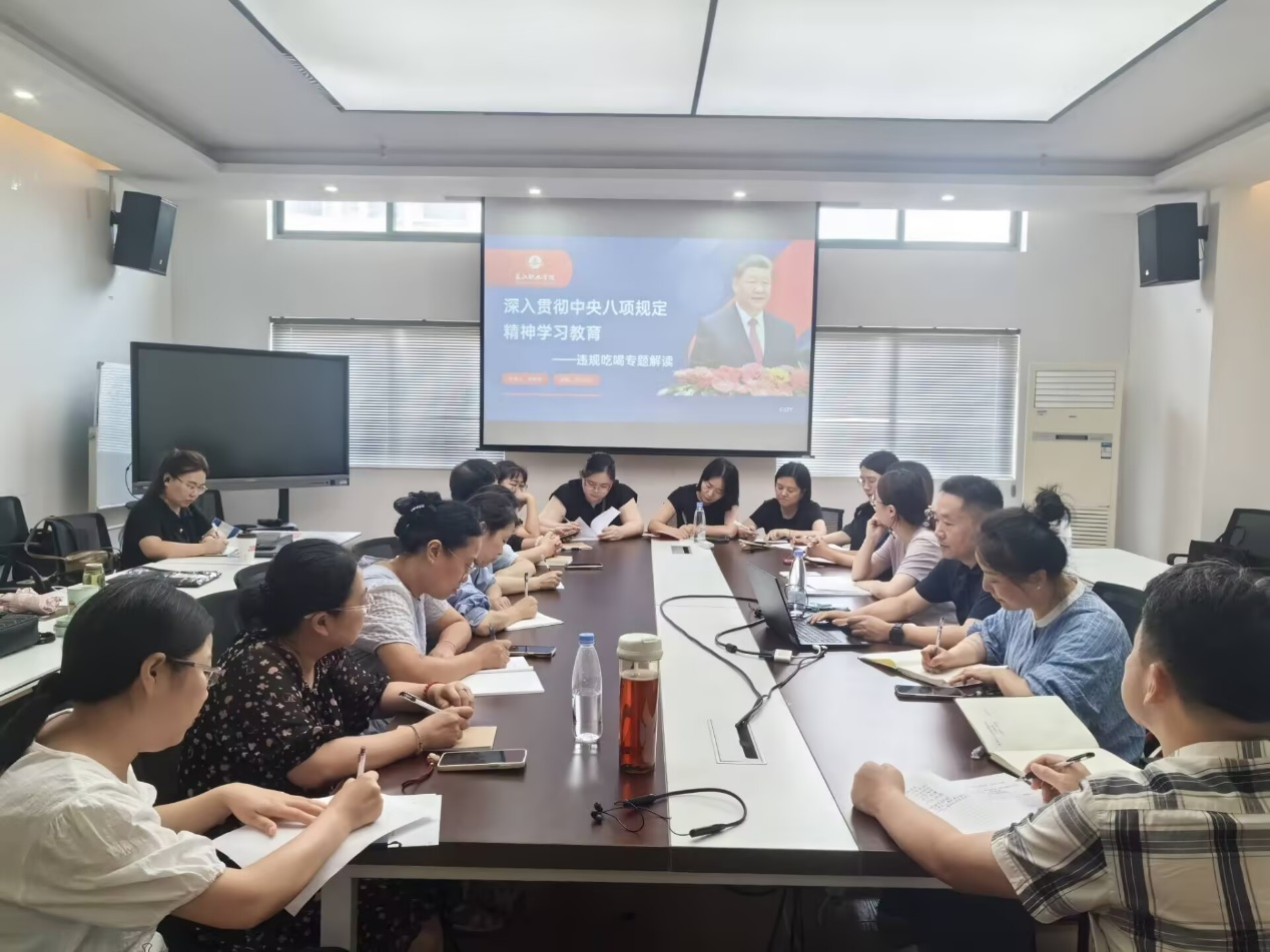 7月9日下午,财经旅游学院在光谷校区明德楼202会议室举办深入贯彻中央八项规定精神的学习教育专题党课活动。学校纪委书记张术平受邀出席,并以《违规吃喝专题解读》,为高级职称教师讲授专题廉政党课。
