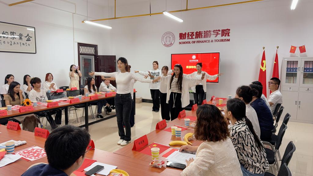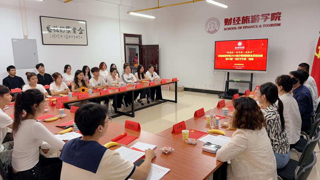 在国庆和中秋双节来临之际,2025年9月30日晚,财经旅游学院在武汉新城校区启航楼704会议室顺利举办2025级少数民族新生茶话会暨第52期“书记下午茶”活动,学院领导班子、学工团队以及2025级少数民族学生代表共计35人欢聚一堂,围绕“迎国庆·庆中秋·话成长”主题,共叙情谊、共话未来。活动由党总支副书记赵秋丹主持。